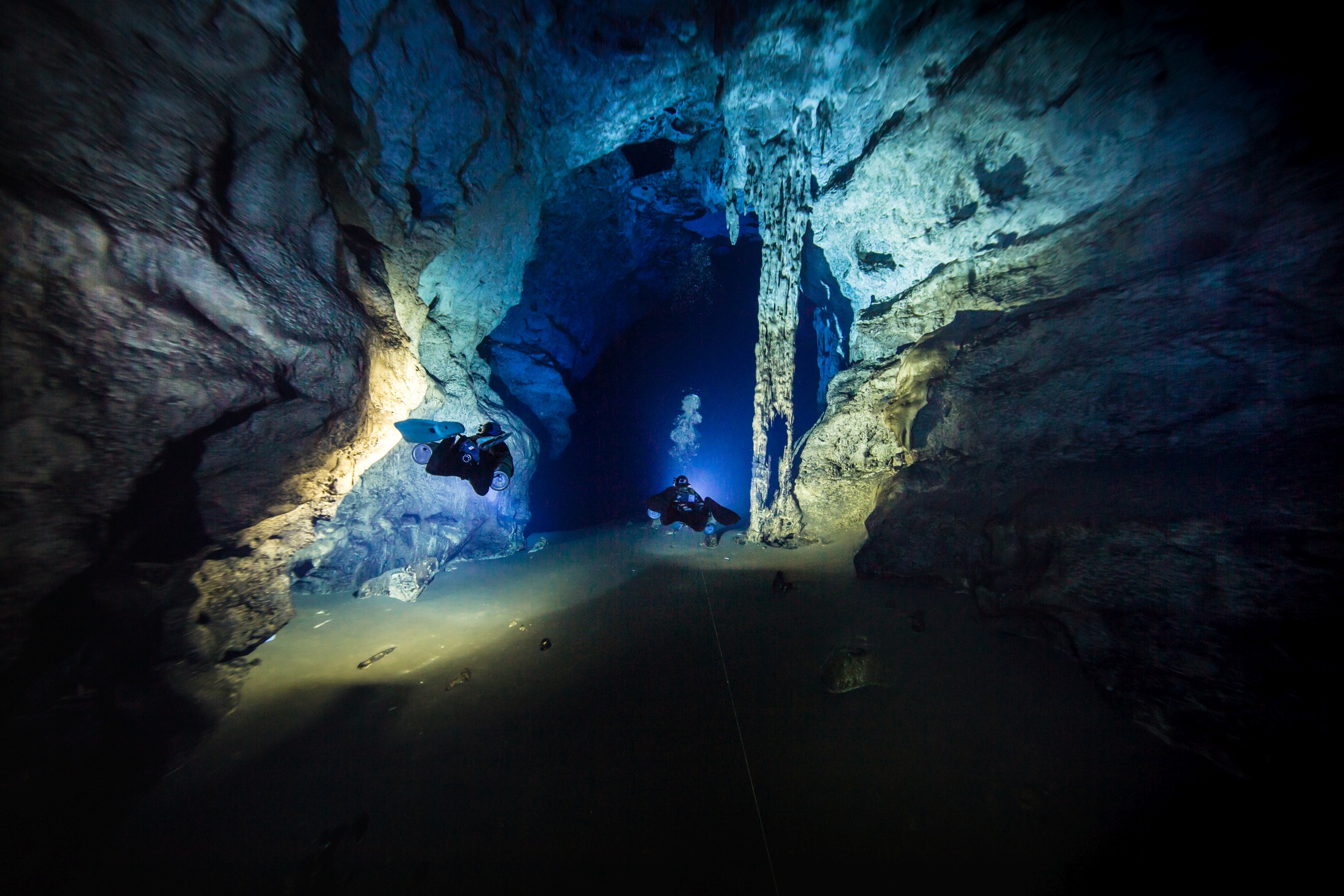 Entering the cave required the agility of the locals in tree and boulder climbing or the more technical rappelling skills the team wisely chose to employ. Arrival at dive base at the end of a huge collapse was somewhat underwhelming as a small 1m diameter muddy puddle awaited. In reality this turned into an Alic in Wonderland style rabbit hole. Day one, the team emptied one reel and whilst having pushed further than in any previous cave, it did not look promising. On day 2 a wonderland revealed itself as pushing on through a small hole the team found themselves in a stunningly beautiful and enormous room. Laying 2 full exploration reels worth of line in less than 40 minutes the team had discovered one of the biggest caves in the world, Malazamanga.